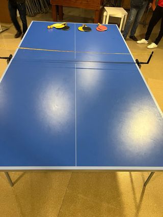 Mesa de ping pong lista para usar. Ideal para pasar ratos divertidos. - Superficie de juego azul. - Patas metálicas plegables.