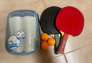 Set de ping pong de mesa Decathlon. Perfecto para pasar un buen rato. - Dos palas de ping pong. - Dos pelotas de ping pong. - Funda de transporte con cremallera. LAS PALAS TIENEN UNA MARCA CON ROTULADOR EN FORMA DE (U) Y FALTA UNA PELOTA.