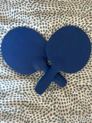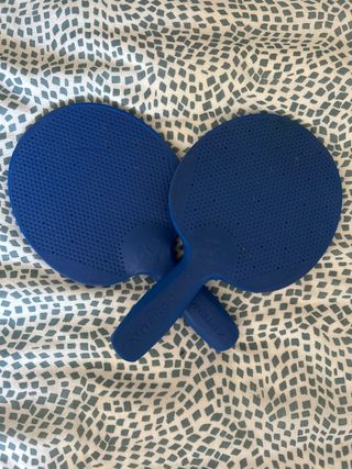 Dos palas de ping-pong de color azul. - Diseño con agujeros en la superficie. - Mango con marca visible.
