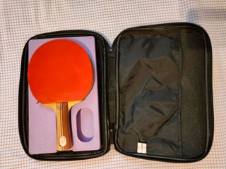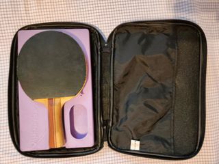 Set de raquetas de ping pong Joola con pelotas. - Incluye dos raquetas. - Tres pelotas blancas. - Funda de transporte con cremallera. una de las raquetas se encuentra dañada de un golpe.