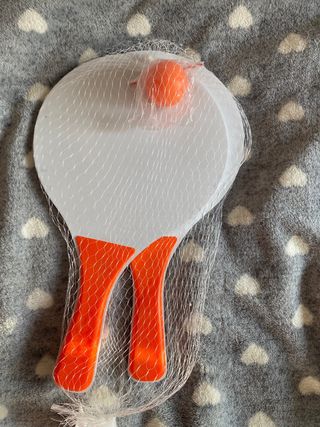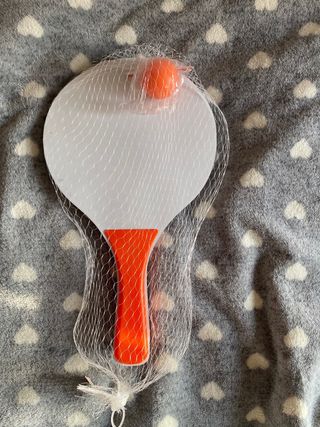 Set de palas de ping pong con una pelota naranja, todo dentro de una malla. - Dos palas blancas con mangos naranjas. - Una pelota de ping pong naranja.