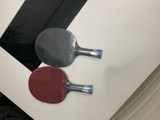 Set de dos paletas de ping pong, una roja y otra negra, junto con tres pelotas (una naranja y dos blancas). Incluye una funda azul para las paletas. - Paleta roja con mango de madera. - Paleta negra con mango de madera. - Tres pelotas de ping pong.