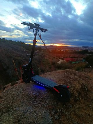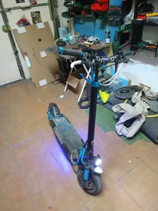 Patinete eléctrico con un diseño moderno y luces LED decorativas en la base. - Base con iluminación LED multicolor. - Ruedas negras con detalles azules. - Manillar negro con accesorios. - Velocidad máxima 40km/h se limita con aplicación - Autonomía de 35-40km - Motor de 600w - Ruedas 10 pulgadas Precio Negociable NO MAREANTES