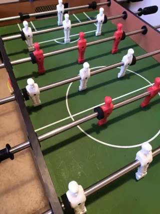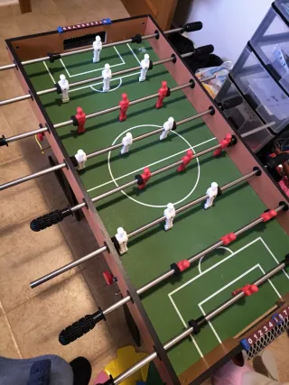 Mesa de futbolín y billar plegable, para horas de diversión. Ideal para reuniones familiares o con amigos. - Campo de juego verde con líneas blancas. - Varillas metálicas con jugadores rojos y blancos. - Marcador de puntos en cada extremo. - Juego de billar completo - Plegable, permite colocar la mesa en vertical para ahorrar espacio cuando no se usa 100x50 cm y 70 cm de alto
