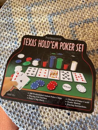 Set de póker Texas Hold'em profesional con todo lo necesario para una partida. - 200 fichas de póker profesionales. - Superficie de fieltro para jugar. - Bandeja para fichas. - 2 barajas de cartas. - Ficha de dealer. - Instrucciones de juego.