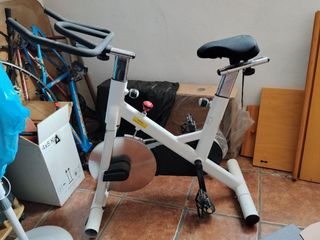 Bicicleta estática de color blanco, ideal para entrenamientos en casa. - Diseño moderno y compacto. - Manillar ajustable. - Sillín ergonómico. - Pedales con agarre. Cuenta kilómetros en perfecto estado.