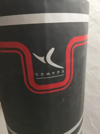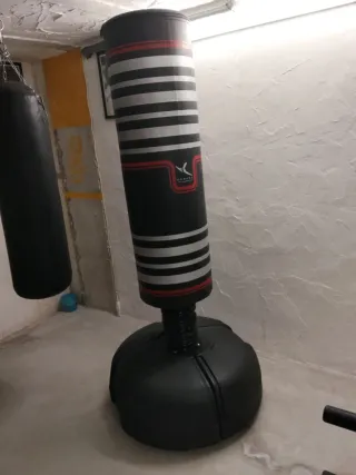 Saco de boxeo de pie con base rellenable para mayor estabilidad. Ideal para entrenamientos. - Diseño con bandas plateadas y rojas. - Base negra. - Marca visible en el saco.
