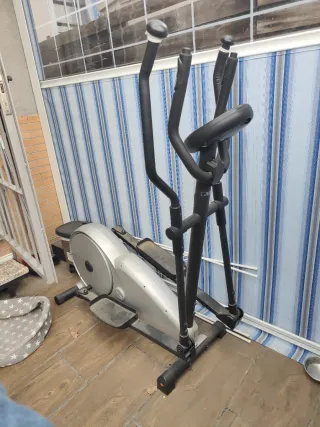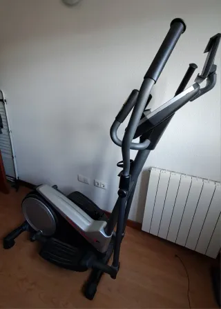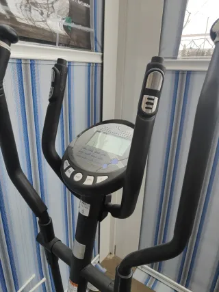 Máquina elíptica para ejercicio en casa, con un diseño moderno en color plateado y negro. Con polvo de estar guardada. En muy buenas condiciones - Estructura principal en color plateado. - Manillares y pedales en color negro. - Base estable para mayor seguridad.
