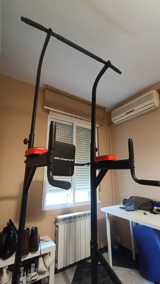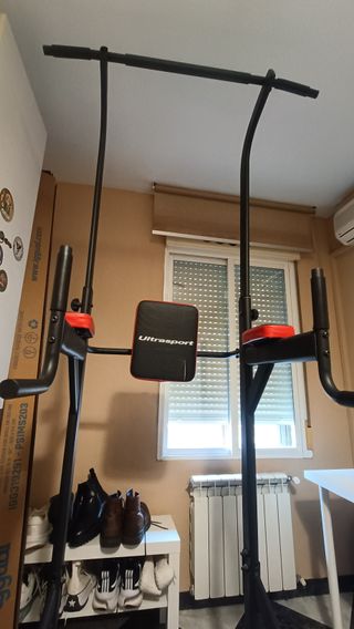 Estación multifuncional para entrenar en casa. - Barra de dominadas. - Soportes para fondos. - Cojín de apoyo para espalda.