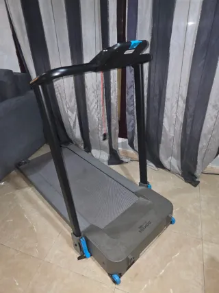 Cinta de correr Domyos, ideal para entrenamientos en casa. - Diseño plegable para fácil almacenamiento. - Ruedas para un transporte sencillo. - Color gris con detalles en azul.
