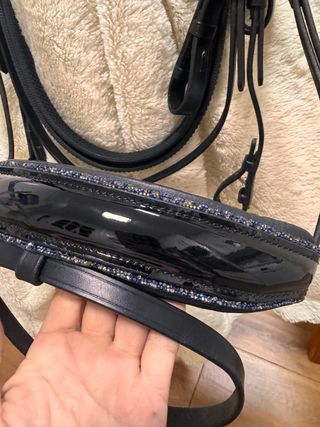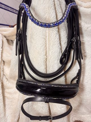 Elegante cabezada de brida para trabajo, adornada con brillantes cristales azules. - Frontalera con incrustaciones de cristales. - Muserola brillante y decorada. - Fabricada en cuero negro. Riendas incluídas. Cuero premium muy blandito con testera anatòmica , muserola charol. solo quedan tres en talla full. Queda espectacular