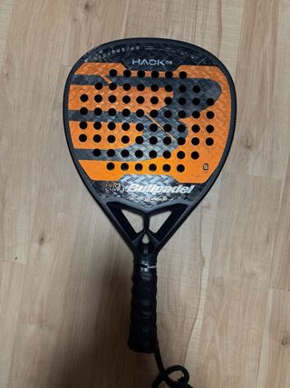 Pala de pádel Bullpadel Hack 03. Tiene una fisura en el parte superior. De momento no es demasiado grande. - Diseño en negro y naranja. - Superficie con agujeros. - Mango con grip negro.