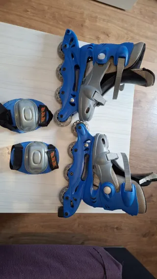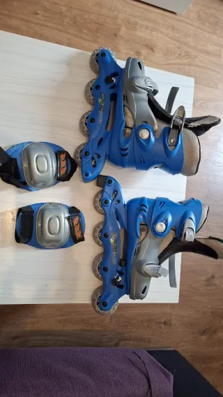Set de patines infantiles en color azul y gris. Son ajustables hasta la talla 37. - Incluye protecciones para rodillas y codos. - Diseño deportivo y moderno.