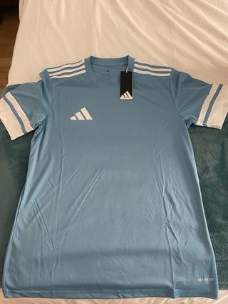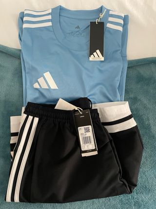 Conjunto deportivo de Adidas que incluye camiseta y pantalón talla M. - Camiseta azul con logo blanco. - Pantalón negro con detalles de rayas blancas. - Nuevos, con etiquetas. - También vendo por separado: Camiseta: 12€ Pantalón: 22€