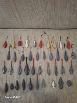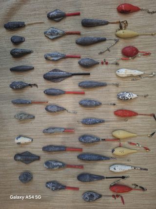 LOTE DE 50 PLOMOS PARA SURFCASTING USADOS PERO EN PERFECTO ESTADO, VAN DE 130 A 100 GR APROX, AUNQUE LA MAYOR PARTE DE ELLOS SON DE 120 GR. ALGUNOS DE ELLOS TIENEN EMERILLONES URFES ENGANCHES RAPIDOS Y 6 DE ELLOS SON LUMINISCENTES