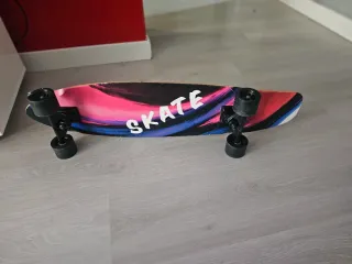 Patinete eléctrico con un diseño llamativo y colorido. - Plataforma de madera con detalles a rayas. - Ruedas negras. - Manillar de color verde menta. Para manitas tiene todo nuevo ruedas frenos manillar . Doble bateria pero un solo cargador le falta arreglar la lus del freno y pegar la tapa de la consola. Inflar las ruedas , y ya estaria andando . Ojo ahora mismo tiene baretia y funciona muy bien y fuerte
