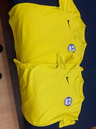 Lote de dos camisetas de entrenamiento para niño, talla L, del club Nuevo Boadilla. - Color amarillo vibrante. - Logo del club en el pecho. - Marca Nike con su característico swoosh.