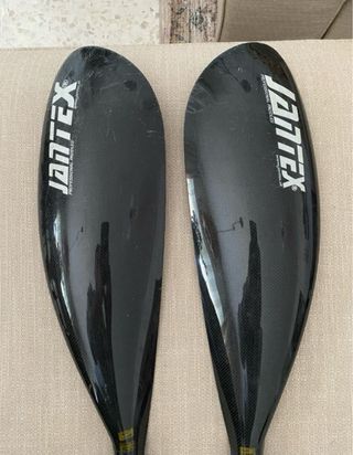 Pala de fibra de carbono JANTEX. Regulable en angulo palas y longitud. Muy ligera y con excelente agarre en el agua sin ser extrema. Pala de 515mm x 168mm, 255 gramos y 805 cm2. de superficie. Muy buen estado.