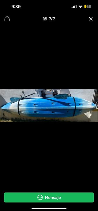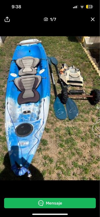 kayak como nuevo. Muy poco usado. 2 plazas más niño. ideal ocio y/o pesca. Tiene cañeros y varios espacios para guardar objetos. Remos. Navegación muy estable. Guardado siempre en garaje. Es un kayak con 2 asientos adulto y uno de niño. Navega super bien, peso máximo carga 250kg. Varios cañeros. Soporte para motor. Varios tambuchos. Línea de vida. Agarraderos. Reposapiés. Remos. Regalo todos los extras, incluso las ruedas para transporte.