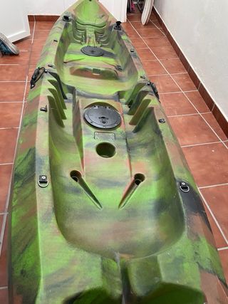 Se vende kayak de 385 cm de longitud. 50 de ancho. Muy estable soporta mas de 300 kg con 4 cañeros fijos y 2 moviles . Se vende por no poder usar por enfermedad. Tiene 2 remos , 2 asientos con bolsillos con cremallera para guardar cosas, 2 tambuchos con saco y tamben el conjunto de ruedas para transportar el kayak sin abrir. Tambien opcion de soporte para la sujeccion del motor. (esta en las fotos) color camuflado. También se hace precio si se compra motor a propulsión con el kayak , 580€ todo Kayak, canoa, piragua, barca, mar, mediterraneo, pesca.....