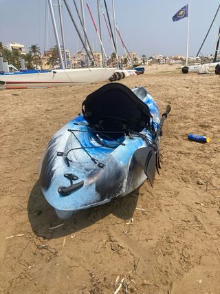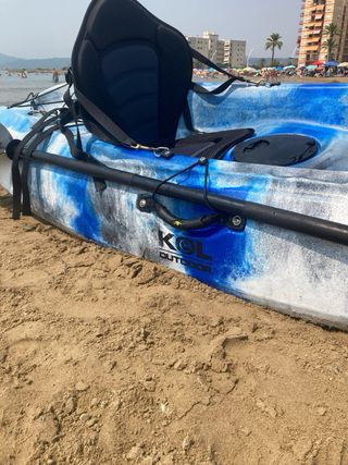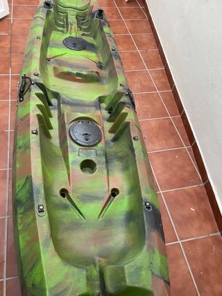 Kayak de una plaza, usado, en buen estado. cuenta con soporte para caña y remos. el hueco que se ve es para poner el cubo en caso de pescar.