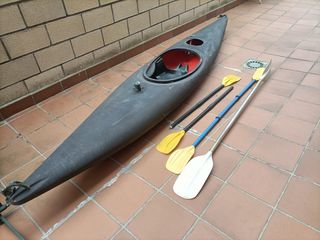 Kayak de mar muy estable. Longitud 2.99 cm. 2 tambuchos estancos para guardar cosas. Cañero direccional delantero totalmente desmontable. Dos cañeros traseros. Ancho de 77 cm. Asiento ergonomico. Chaleco salvavidas. Carro de transporte plegable. Soporte motor de aluminio realizado por herrero irrompible. Y otro soporte motor ya puesgo en el kayak. Dos palas para remar. Con carro de varada 100 euros mas.. kayak. Piragua. Canoa. Es de una plaza. 6 agujeros de drenaje con sus tapones. Las ruedas de transporte son las que van en la foto sola. El carro de varada es el que tiene el kayak en las fotos. Adstenerse de hacer ofertas adsurdas