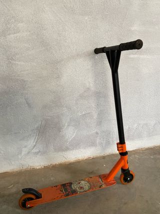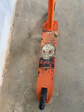 Patinete de estilo urbano con un diseño llamativo. - Color naranja vibrante. - Ruedas de goma. - Plataforma con gráfico de calavera.
