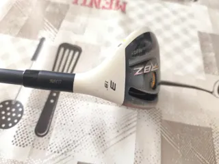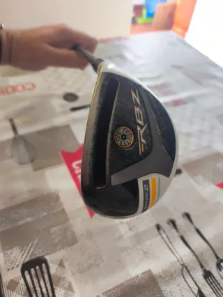 Híbrido 3 TaylorMade RocketBallz (RBZ) Stage 2 de 19 grados. Diseñado para ofrecer máxima distancia y facilidad de despegue desde cualquier posición en el campo. Varilla: RocketFuel 65 grafito. Flex: Regular. Grip: Golf Pride Multicompound. Estado: Presenta marcas estéticas evidentes en la cara y suela que no afectan al rendimiento funcional del palo. Palo potente y fiable.