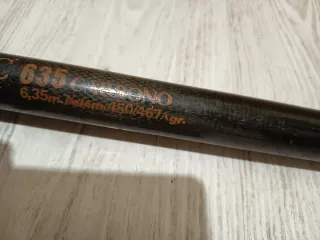 Caña de pescar telescópica de color negro con detalles en rojo. - Mango de goma. - Anillas para sedal.