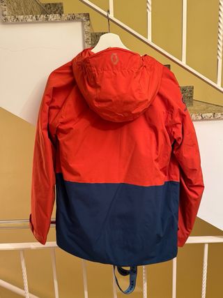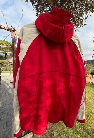 Conjunto de dos chaquetas de esquí, en color rojo y gris. Perfectas para disfrutar de la montaña. - Chaqueta principal en rojo vibrante. - Detalles y mangas en color gris claro. - Capucha integrada. Talla L y S
