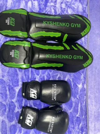 Set de equipo de entrenamiento deportivo. - Rodilleras negras con detalles verdes y logo Kyshenko Gym. - Guantes de boxeo negros KO System talla 10 oz.