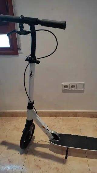 Patinete scooter de color rojo con detalles blancos. - Puños grises con relieve, nuevos. - Base lija negra para los pies. - Ruedas negras. - Medida para peques de 4 a 10 años, és el periodo que lo ha usado mi hijo. - No he puesto más que en condiciones aceptables porqué mis llaves allen se doblan si intento aflojar las ruedas, són de las que regalan para montar. Imagino que con unas buenas Allen se puede aflojar, para cambiar ruedas/cojinetes. - Parece mojado de la base pero es 6 en 1, que le puse a los cojinetes. - Soporte de la foto NO incluido.