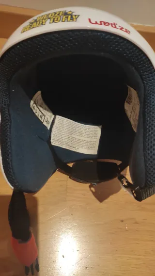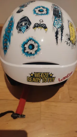 Casco de esquí infantil de la marca Wedze, con un diseño blanco y decorado con pegatinas. - Diseño blanco con pegatinas. - Marca: Wedze. - Cierre ajustable.