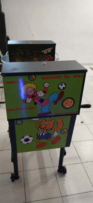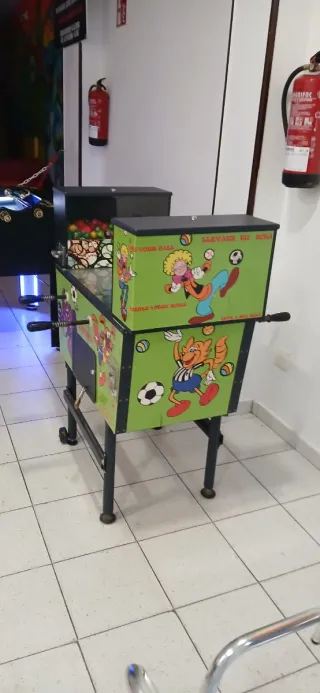Futbolín infantil con un diseño divertido y colorido, ideal para los más pequeños. Presenta personajes animados y temática de fútbol. - Estructura de color verde con ilustraciones. - Barras de control para los jugadores.