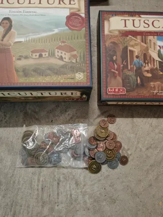 Juego de mesa Viticulture con su expansión Tuscany, expansión visitantes del valle del rin y monedas metálicas.
