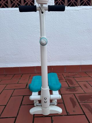Bicicleta elíptica Domyos en color blanco y azul. - Pantalla digital con información del ejercicio. - Pedales amplios y antideslizantes. - Empuñaduras acolchadas para mayor comodidad.