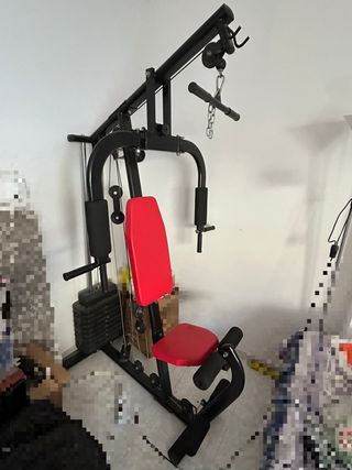 Aparato de gimnasio para entrenar en casa. Cuenta con un diseño robusto y asiento acolchado. - Estructura de metal negro. - Asiento y respaldo en color rojo. - Torre de pesas incluida. - Las almohadillas de espuma protectoras de la rodilla están un poco desgastadas pero funcionan bien.