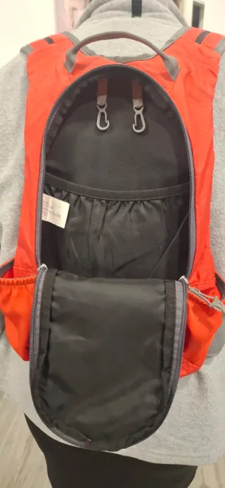 Mochila ligera y compacta de la marca Trango World. - Color naranja vibrante. - Modelo TX 10. - Compartimento principal con cremallera. - Bolsillos laterales de malla. - Cuerda elástica frontal para ajuste. Prácticamente nueva, sin usar.