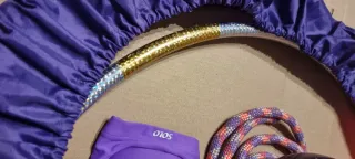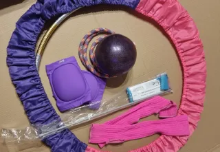 Conjunto de elementos para gimnasia rítmica para niña pequeña. - Aro 62cm diámetro (necesita cambiar el celofán como se aprecia en las fotos) con funda morada y rosa. - Pelota morada brillante reglamentaria (se envía sin hinchar al completo para facilitar el embalaje) - Cuerda de gimnasia de 208 cm sin nudos - Rodilleras moradas. - Cinta de gimnasia en sin estrenar de 4m - Calentadores de piernas. Todo como nuevo salvo el aro.