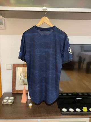 Camiseta del Real Madrid de la temporada 19-20, utilizada en la Champions League. Diseño en color azul marino con detalles dorados. - Logo de Adidas. - Escudo del Real Madrid. - Patrocinador Fly Emirates.