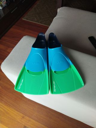 Aletas de natación de la marca Nabaiji, ideales para principiantes. Son de color azul y verde, y están en buen estado. - Marca: Nabaiji - Color: Azul y verde - Material: Plástico resistente - Perfecto para iniciarse en la natación.