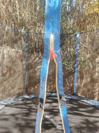 Cama elástica de exterior con red de seguridad para mayor protección. - Diámetro de 2.40 metros. - Estructura metálica. - Red de seguridad incluida. Con algunos desperfectos,se ha de desmontar