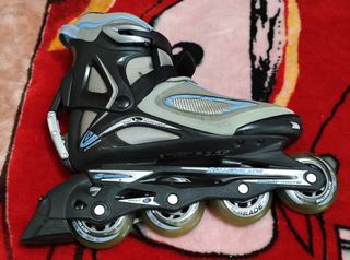 Patines en línea Rollerblade Training para mujer, talla 41. Diseñados para entrenamiento y comodidad. - Color gris y azul. - Cierre de velcro y cordones. - Ruedas Rollerblade. - Mochila de transporte incluida. - Rodilleras. - Coderas. - Muñequeras.