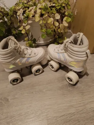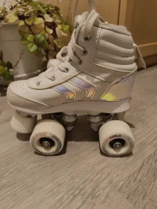 Patines en línea para niña de Decathlon. - Talla 31. - Diseño blanco con detalles iridiscentes. - Cierre de velcro y cordones.