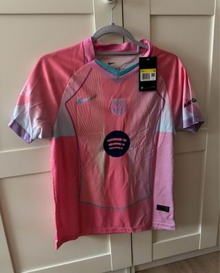 Juego deportivo compuesto por camiseta y short del Barça en tono rosa. Contenido: camiseta y pantalón corto. Talla: 28 para niño. Recomendado para estatura aproximada entre 1.55 m y 1.65 m. Medidas de la camiseta: 62 cm de largo y 44 cm de pecho. Medidas del short: 43 cm de largo.