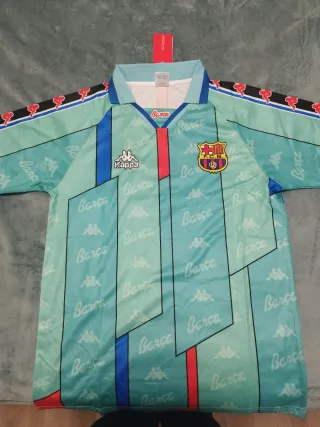 Camiseta de fútbol vintage del FC Barcelona, dorsal 10 de Romario. - Color principal turquesa. - Diseño con detalles en azul y rojo en mangas y cuello. - Logo de Kappa repetido en las mangas y en el tejido. - Nombre 'Romario' y número '10' en blanco con borde azul.