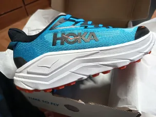 Playeras Hoka de color azul con detalles en naranja y negro. Diseñadas para el deporte. - Parte superior de malla transpirable. - Suela de goma con buen agarre. - Logotipo Hoka en los laterales.