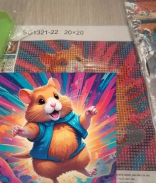 Kit de pintura de diamantes con un diseño vibrante de hámster. - Lienzo de 20x20 cm. - Incluye todos los diamantes necesarios para completar la obra. - Diseño colorido y llamativo.