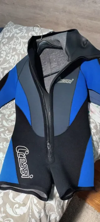 Traje de neopreno Cressi de 5mm shorty con capucha integrada,para buceo, T4,muy poco uso,se regala el traje mono correspondiente igual 5mmT4 usado. Gastos de envío a cargo del comprador - Color azul, gris y negro. - Cremallera frontal. - Logo de Cressi visible.