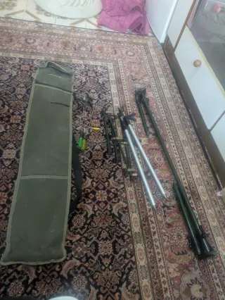 Conjunto de pesca completo, ideal para disfrutar de salidas al aire libre. - Caña de pescar regulable de 3 a 5m marca Grauvell Teknos, modelo Trout AD 5800. - Carrete de pesca. - Caña coup Shakespeare 8m Trípode regulable y extensible con funda original. Acepto cambios